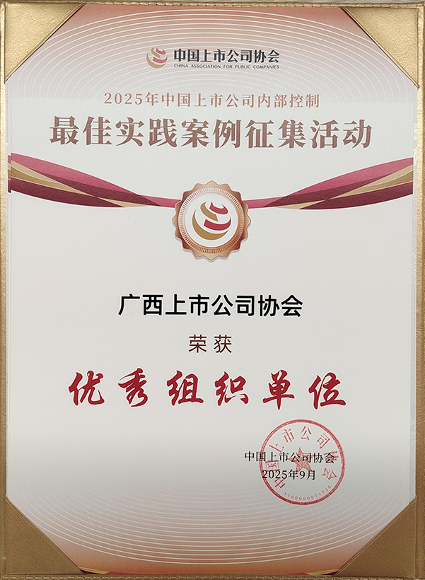 近日,中国上市公司协会(以下简称“中上协”)公布了2025年上市公司内部控制最佳实践案例征集活动评选结果。广西上市公司协会(以下简称“协会”)在活动中表现突出,荣获“优秀组织单位”称号,充分展现了协会在推动辖区上市公司内部控制建设与高质量发展方面的组织能力和服务成效。